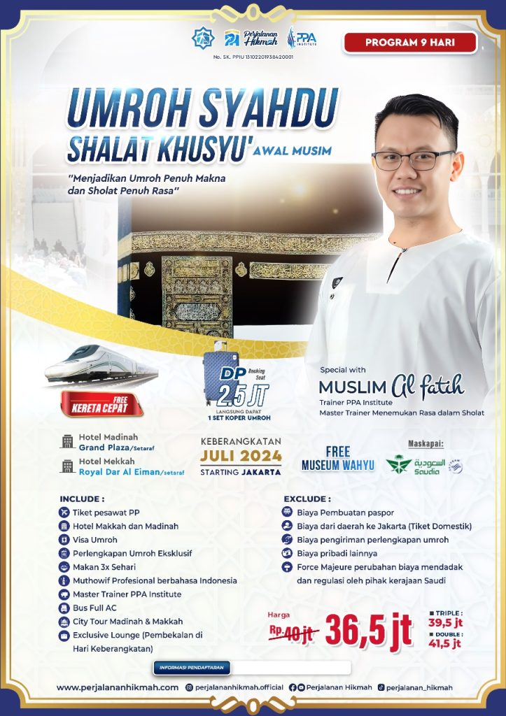 Umroh Syahdu Shalat Khusyu di Awal Musim adalah Umroh Tematik persembahan dari PPA Institute dan Perjalanan Hikmah yang akan menjadikan perjalanan ibadah Umroh Anda sepenuh Rasa, yang membuat Shalat menjadi lebih khusyu insya Allah sampai Anda tiba di Tanah Air.